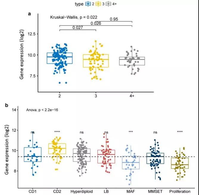 该研究比较了不同ISS分期中BCAR3的表达水平。BCAR3的表达在I、II、III期呈下降趋势(P=0.00068, Kruskal-Wallis test)。II期与III期间无统计学差异(P=0.39, Wilcoxon test)。同时该研究比较了不同血清型分层下BCAR3在不同分期的表达水平。在血清免疫球蛋白A (IgA)组和血清免疫球蛋白G (IgG)组,BCAR3在I、II、III期的表达逐渐下降(IgA: P=0.013;IgG: P=0.04; Kruskal-Wallis test)。但血清游离轻链(FLC,轻链骨髓瘤亚型)组无统计学意义(FLC: P=0.39; Kruskal-Wallis test)。