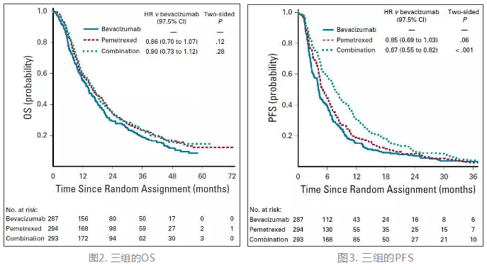 2. 疗效:全组患者的ORR及OS分别为30.3%和13.1个月。经过中位50.6个月的随访后,培美曲塞组和贝伐珠单抗组的OS分别为15.9个月和14.4个月,差异无统计学意义(HR=0.86; 97.5% CI: 0.70-1.07; P=0.12),联合治疗组OS为16.4个月,与贝伐单药组相比,差异同样无统计学意义(HR=0.90, 97.5% CI: 0.73-1.12; P=0.28)(图2)。培美曲塞组的PFS为5.1个月,与贝伐珠单抗的4.2个月相比,差异无统计学意义(HR=0.85; 97.5% CI: 0.69-1.03; P=0.06),劣于联合治疗组的7.5个月(HR=0.67; 97.5% CI: 0.55-0.82; P<0.001) (图3)。维持治疗阶段,培美曲塞组、贝伐珠单抗组和联合治疗组的ORR分别为18.7%(97.5% CI: 13.9%-24.4%)、12.5%(97.5%: 8.5%-17.6%)和21.2%(97.5% CI: 16%-27%)。