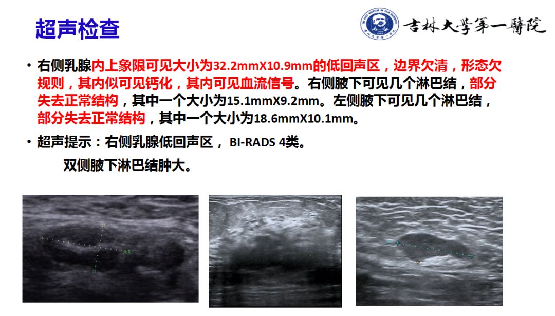 2.右侧乳腺内上象限可触及一片状质韧区,范围约4.0 x 2.0cm,边界欠清。右侧腋下可触及一枚淋巴结,大小为2.0cm x 1.0cm ,质软,边界清,活动度尚可。左侧腋下也可触及一同样大小及性质的淋巴结。