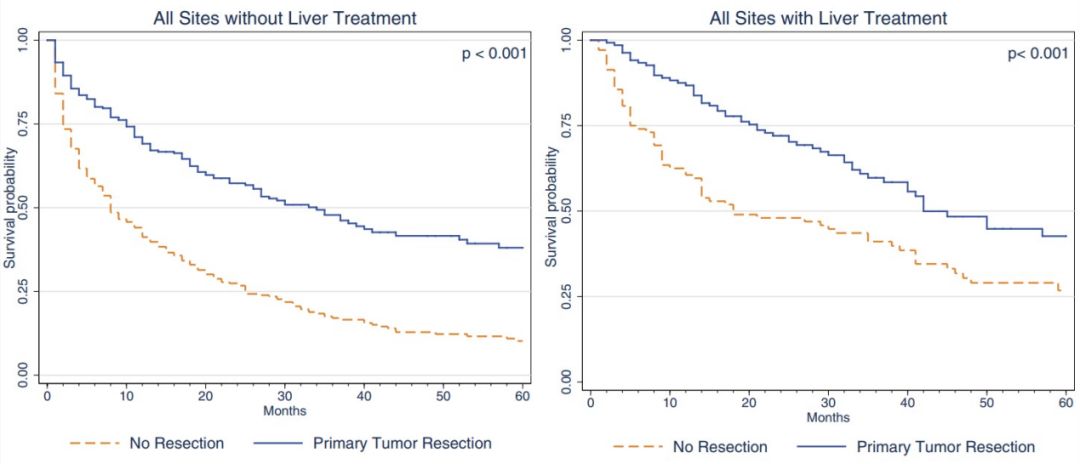 图1. 在未行(A)和进行(B)肝转移瘤治疗的所有部位NET患者中,原发肿瘤切除和不切除的患者生存率对比