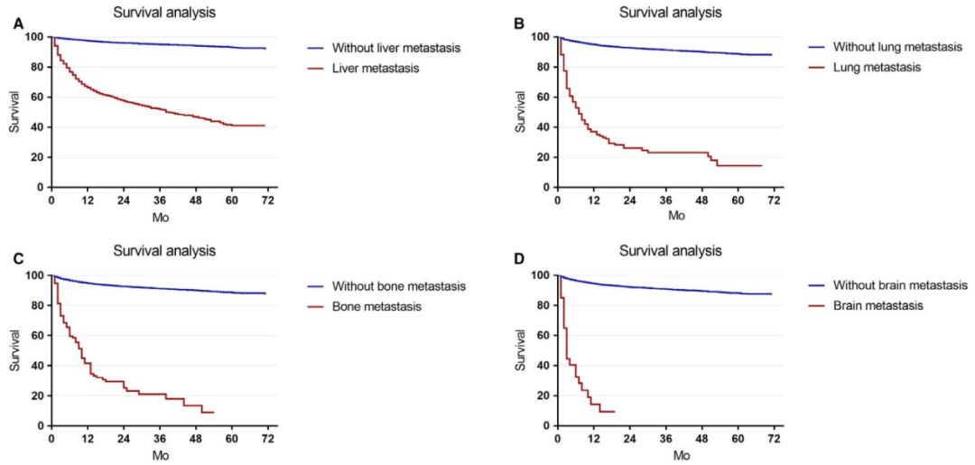 图3. GI-NEN 伴肝、肺、骨或脑转移患者的生存分析。A:伴或不伴肝转移患者,P<0.001;B:伴或不伴肺转移患者,P<0.001;C:伴或不伴骨转移患者,P<0.001;D:伴或不伴脑转移患者,P<0.001。