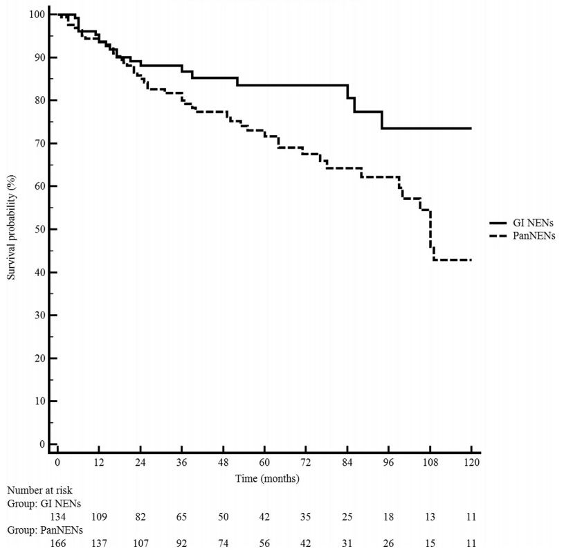 图5. PanNENs和GI NENs的总生存对比(p=0.012)