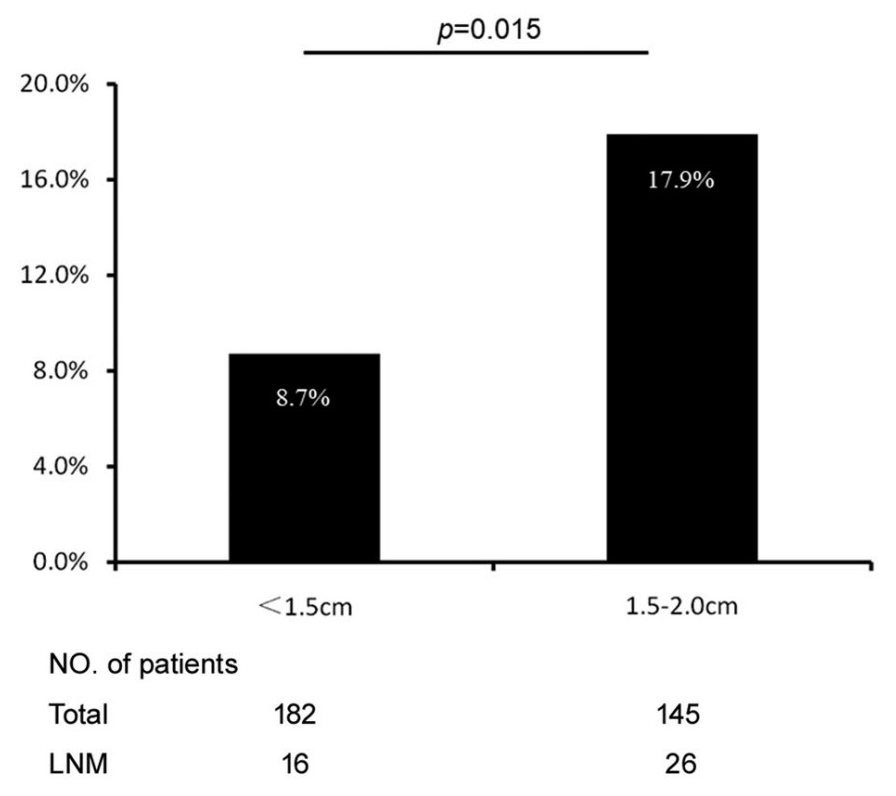 结果:共识别392例NF-pNETs ≤2 cm的患者。在328例行淋巴结清扫术和评估的患者中,42例(12.8%)出现LNM。LNM与术后肿瘤复发相关(风险比,3.06;P=0.026)。与不伴LNM患者相比,伴LNM患者的RFS较差(5年RFS,81.7% vs 94.1%;P=0.019)。肿瘤大小为1.5-2 cm 患者的LNM发生率是肿瘤大小<1.5 cm 患者的两倍(17.9% vs 8.7%,优势比,2.59;P=0.022),并且肿瘤分级及Ki-67水平更高的风险较大(P值均<0.01)。 根治性切除后,共14例(8.0%)肿瘤1.5-2cm的患者和10例(4.5%)肿瘤<1.5cm患者出现肿瘤复发。