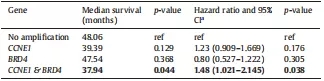 图1. CCNE1、BRD4基因扩增时中位生存期及差异表现