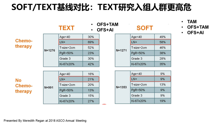 SOFT研究与TEXT研究虽然都是探讨卵巢抑制的获益,但SOFT研究人群相比TEXT研究更加低危。化疗亚组,TEXT研究与SOFT研究淋巴结阳性比率分别为69%和58%,未化疗亚组,TEXT研究与SOFT研究淋巴结阳性比率分别为21%和9%。因此,SOFT研究纳入了他莫昔芬单药组,而TEXT研究从伦理角度考虑较高危患者TAM可能不足够,所以并未纳入他莫昔芬单药组。