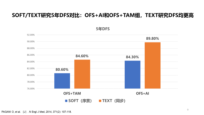 SOFT研究是卵巢抑制序贯化疗,TEXT研究是卵巢抑制同步化疗。因为TEXT研究患者更高危一些,我们推测其DFS可能较SOFT研究会低。然而让人意外的是,TEXT研究卵巢抑制同步化疗的DFS(OFS+AI 89.8%,OFS+TAM 84.6%),相比SOFT研究序贯的DFS(OFS+AI 86.8%,OFS+TAM 80.6%)更高。虽然这两个研究的DFS结果不能简单直接比较,但是因为两个研究是发表在新英格兰医学杂志的大样本研究,而且设计和执行都非常严谨,很好的研究,所以这个DFS结果也非常能说明问题,至少让我们进一步确认了,患者同步相比序贯不会有更差的DFS。