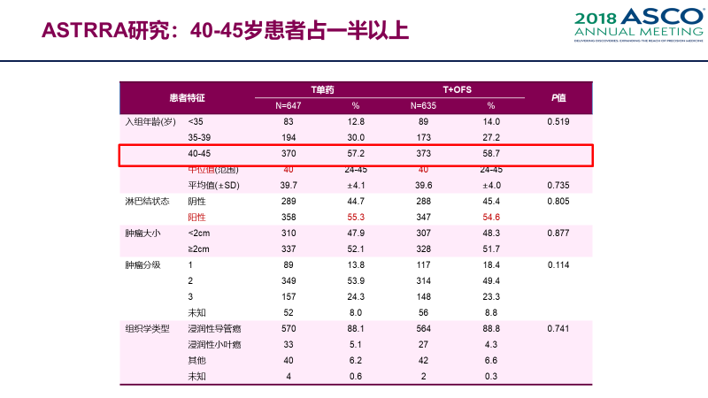 美国女性的平均绝经年龄是51岁,中国女性的平均绝经年龄是49岁,国内外的平均绝经年龄相近,所以国外的研究结果对于中国人群有一定的借鉴意义。40-45岁乳腺癌患者虽然还未达平均绝经年龄,但由于本身卵巢功能有所衰退,又接受化疗,有可能提前绝经。2003年发表的国外IBCSG-IIIV研究中,≥40岁患者化疗后很少恢复月经,是否可以提示我们这部分患者化疗后就真的绝经了呢?相较国外,中国乳腺癌普遍发病年龄较年轻,40-45岁占到乳腺癌总人群的近三分之一,所以讨论这部分人群化疗后的月经消失到底是绝经,还是暂时的闭经,是否可安心不进行卵巢抑制,就非常有现实意义。