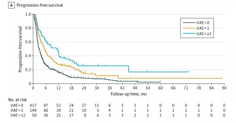 在出现多系统irAE的患者中,与没有irAE的患者相比,出现任意<3度irAE或至少1个≥3度irAE的患者的PFS得到改善,然而只有前者从ICIs治疗中获得显著的OS获益。