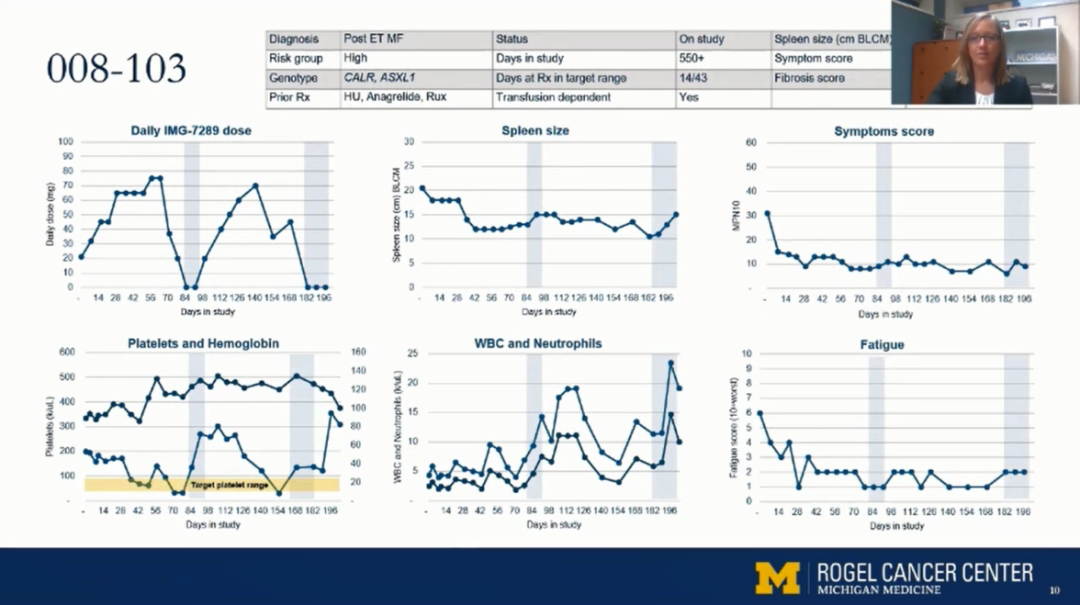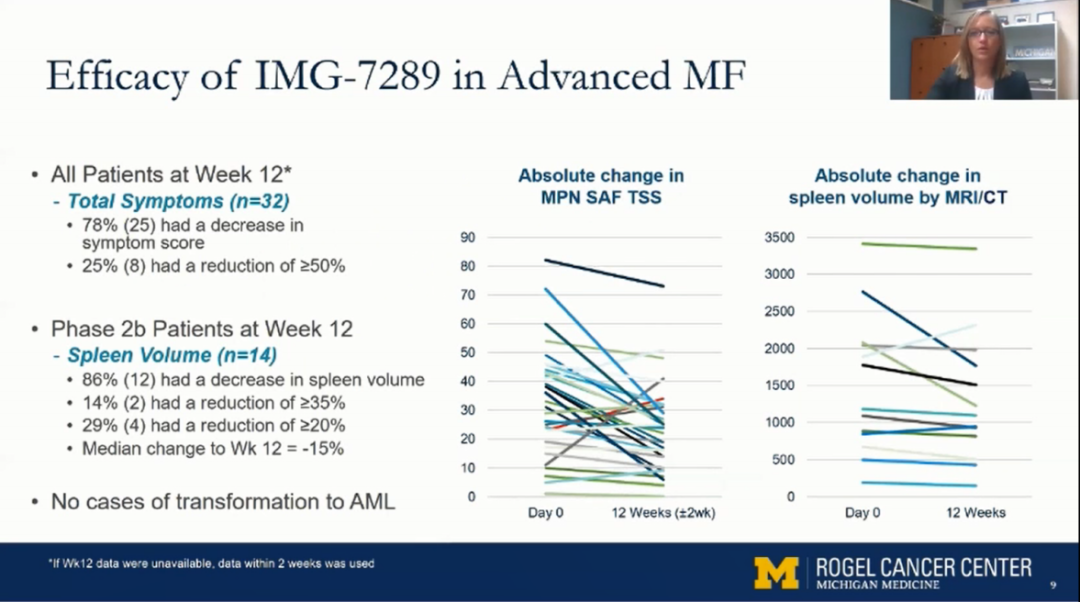 IMG-7289在晚期MF患者中安全且耐受性良好;IMG-7289单药治疗晚期MF患者具有临床有效:临床症状、脾脏体积、贫血、骨髓纤维化不同程度改善;IMG-7289能减少1/3VAF,尤其是ASXL1突变;治疗期间无新的基因突变或进展为AML。