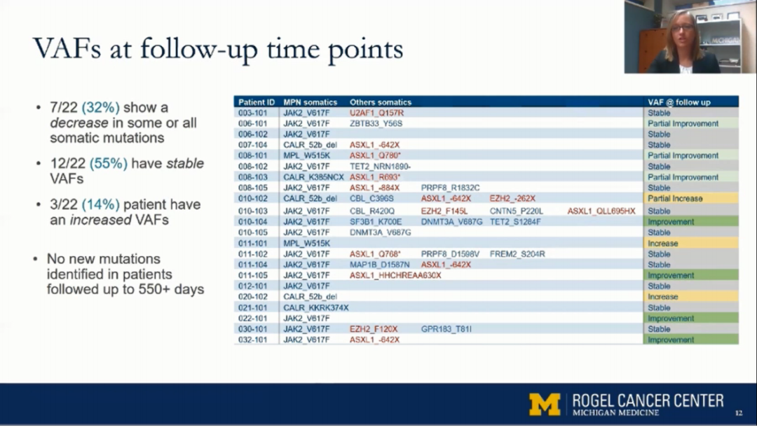在治疗第24周,9/34(27%)达到SVR35, 6/20(30%) TSS (TSS50)降低≥50%,7/34 (21%)BMF有-1/-2级改善,12/26(46%)>有10%的驱动基因VAF减少。观察到第24周的临床反应和VAF减少与HMR突变的存在和突变的基因数量无关。进一步的分析发现β-2微球蛋白(B2M),肿瘤坏死因子受体2(TNFR2)、金属蛋白酶组织抑制剂1 (TIMP-1)和血管细胞粘附分子1(VCAM-1)4种细胞因子与TSS的改善有关。