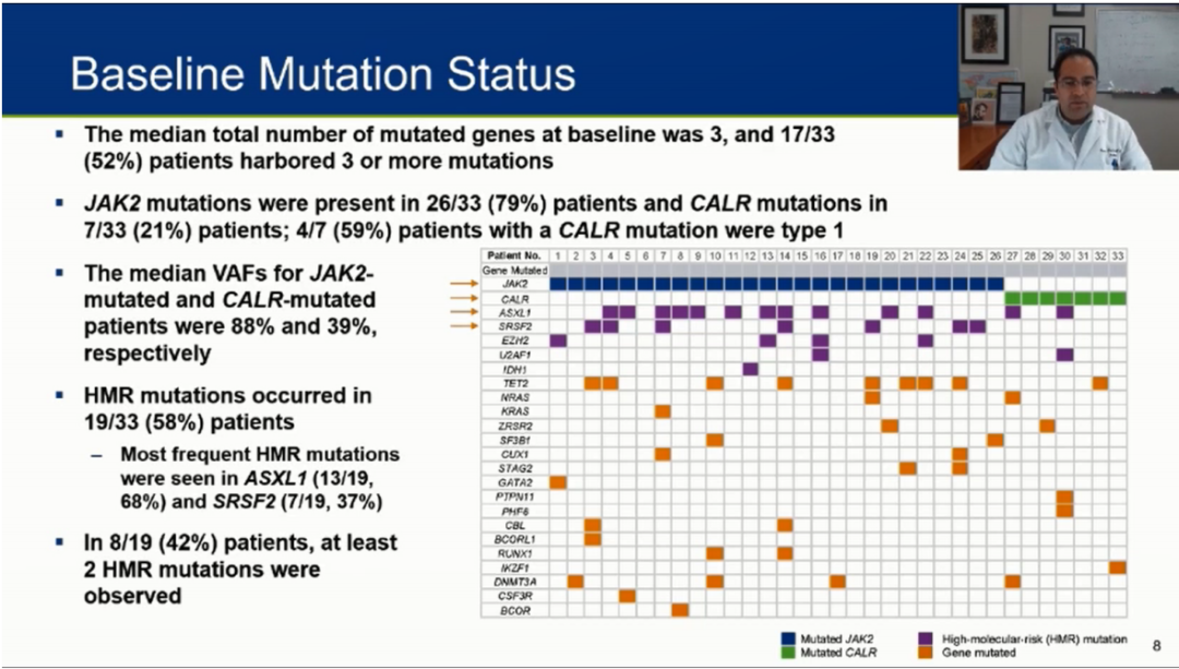 截至2020年2月28日,共纳入34例MF患者接受了≥1剂量Navitoclax+ 芦可替尼治疗。进入研究时,33名患者可进行生物标志物分析。26/33例(79%)患者中出现JAK2突变,7/33例(21%)患者CALR突变阳性。JAK2和CALR突变的患者中位VAFs分别为88%和39%。基线突变分析显示,19/33(58%)名患者中存在HMR基因突变;其中8/19 (42%)HMR基因突变≥2个。ASXL1、SRSF2、EZH2、U2AF1和IDH1的突变率分别为13/19(68%)、7/19(37%)、4/19(21%)、2/19(10%)和1/19(5%)(图1)。在基线检查时,所有突变基因的中位数为3,17/33(52%)的pts具有≥3个突变。