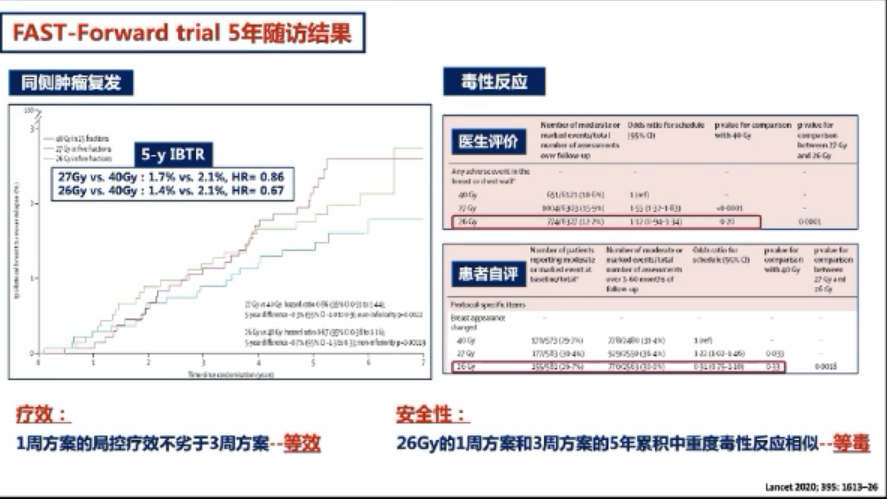 在过去的2020年中,浸润性癌大分割放疗领域也有很多进展。其中一项有意义的研究是FAST-Forward研究,这项研究使用了历史上最短程的治疗方案,用26Gy1周内分割5次方案与40Gy3周内分割15次方案相比,结果显示长达5年的局部肿瘤控制效果并不逊色,而且无不良反应的增加。这项研究是非常成功的,但是仍然留有一些后续提升的空间,最主要是关于瘤床加量的问题。本研究并没有限定做瘤床加量,我想原因可能为研究者担心大分割、超大分割放疗一直延续到瘤床加量部分,会给患者带来瘤床纤维化风险。但在瘤床加量部分研究者又把它恢复到常规分割放疗,在一定程度上会使超短程放疗的优势不太明显。所以我认为,FAST-Forward研究给后续研究留下了一定空间。
