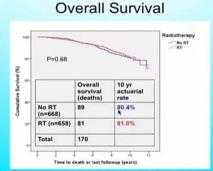 在PRIMEⅡ研究中,我们还可看到另外一个结果,即区域淋巴结(尤其是腋窝淋巴结)的复发在放射治疗组仍然有明显降低。未给予放射治疗的区域复发率为2.3%,而给予放射治疗的患者区域复发率为0.5%,这表明即使是低危患者,相应的区域淋巴结仍然存在一定的复发风险。