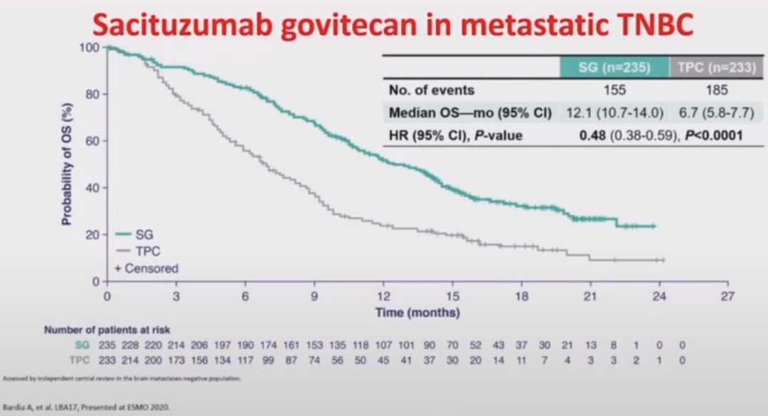 2020年4月,美国FDA批准了首个应用于TNBC的ADC药物Sacituzumab Govitecan(SG),该药物主要靶向TROP2靶点,为TNBC的精准治疗开辟了新的道路。袁芃教授指出,ASCENT研究显示SG在晚期TNBC患者中较医生选择的常规治疗方案显著延长了mPFS(5.6个月vs 1.7个月 p<0.0001)和mOS(12.1个月 vs 6.7个月,P<0.0001),在晚期TNBC总体较差的疗效中,取得了明显的生存优势,SG在晚期TNBC的显效,为早期患者应用提供了很好的思路。