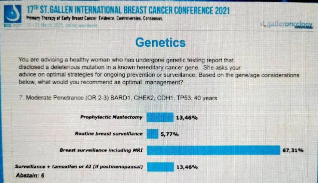 图6:健康女性基因测试报告显示中外显率(OR 2~3)BRCA1,CHECK2,CDH1,TP53突变,年龄40岁,持续预防或监测的最佳策略是什么?13.46%的专家选择“预防性乳房切除”,5.77%的专家选择“常规乳房监测”,67.31%的专家选择“包括MRI在内的乳房监测”,13.46%的专家选择“TAM/AI+监测(如果为绝经后患者)”,6人弃权。