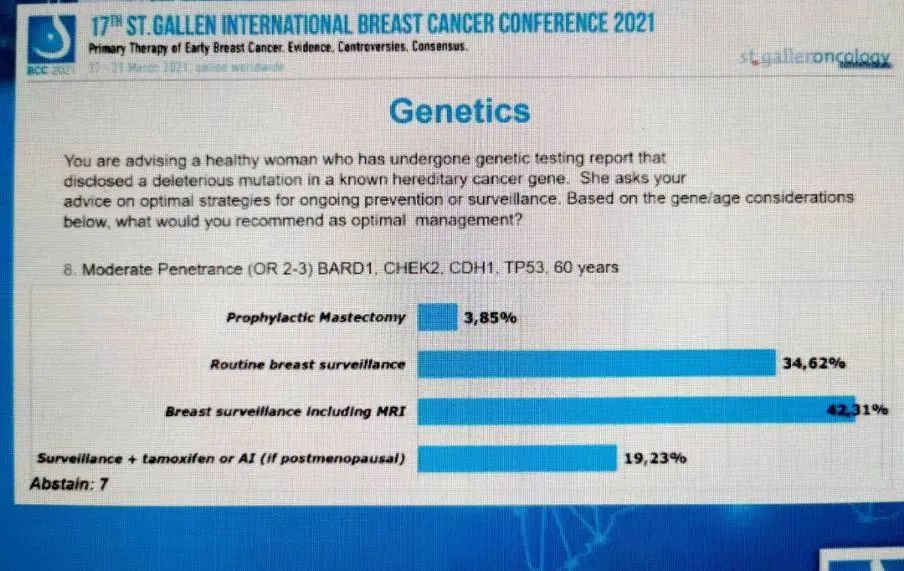 图7:健康女性基因测试报告显示中外显率(OR 2~3)BRCA1,CHECK2,CDH1,TP53突变,年龄60岁,持续预防或监测的最佳策略是什么?3.85%的专家选择“预防性乳房切除”,34.62%的专家选择“常规乳房监测”,42.31%的专家选择“包括MRI在内的乳房监测”,19.23%的专家选择“TAM/AI+监测(如果为绝经后患者)”,7人弃权。