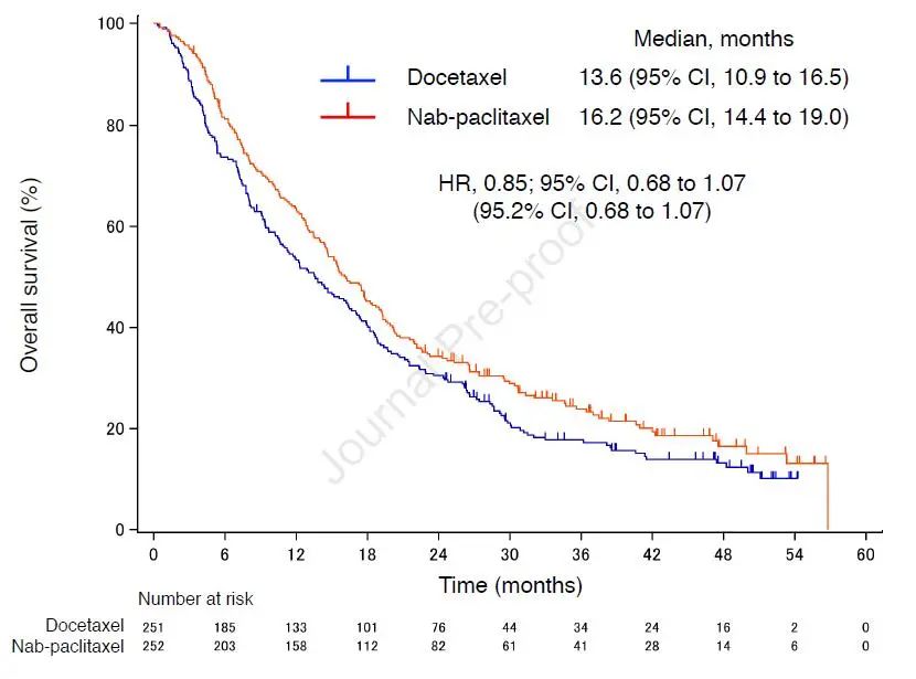 研究数据发现,经过中位15个月的随访后,多西他赛组和白蛋白结合型紫杉醇组分别有84.9%和79.0%的患者出现死亡事件,HR=0.85 (95% CI,0.68-1.07)。以HR=1.25为标准,研究达到非劣效性标准。两组中位OS分别为13.6个月和16.2个月,两年OS率分别为30.5%和34.3%。研究未达到优效性标准,P=0.163(图1)。