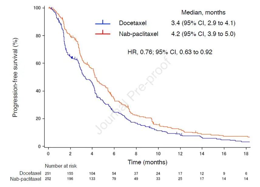 两组分别有90.4%和89.3%的患者出现疾病进展。中位PFS分别为4.2个月和3.4个月,HR=0.76(95% CI, 0.63-0.92,P=0.0042)(图2)。两组分别有228例和231例患者有可评估的病灶,多西他赛组和白蛋白结合型紫杉醇组的ORR分别为15.4%和29.9%,P=0.0002。鳞癌患者的ORR分别为30.4%和10.4%,非鳞癌患者两组ORR分别为29.7%和16.7%。