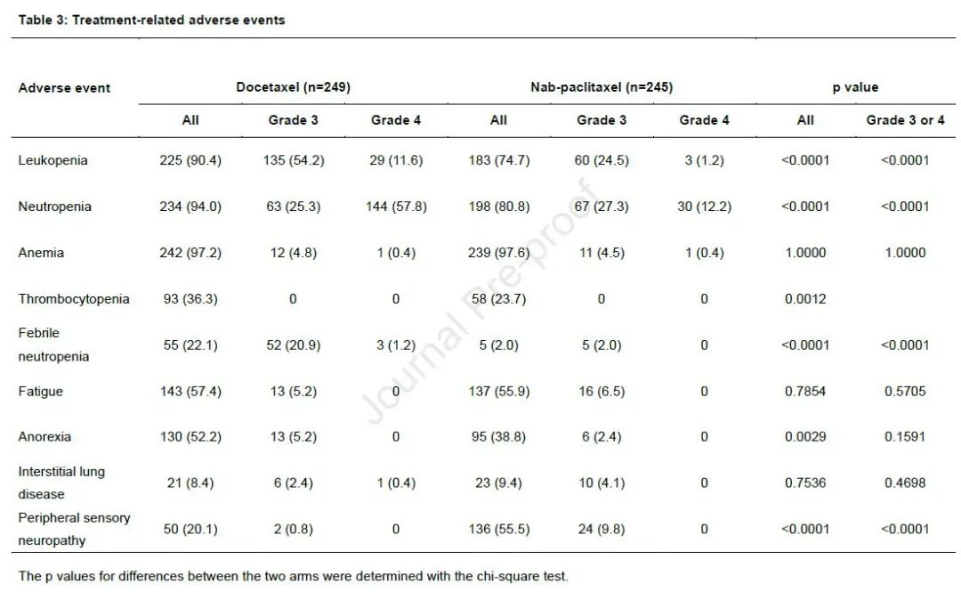结果发现,白蛋白结合型紫杉醇的ORR和PFS优于多西他赛,OS非劣效于多西他赛,虽然白蛋白结合型紫杉醇血液学毒性低于多西他赛,但外周神经病变发生率更高,与多西他赛展现了不同的安全谱。
