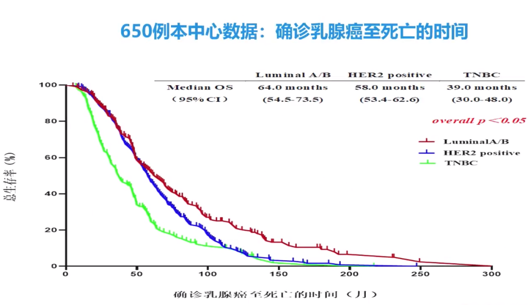 解放军总医院第五医学中心乳腺肿瘤科650例确诊乳腺癌至死亡时间的研究显示,Luminal A/B型患者的中位OS为64.0个月(95%CI:54.5~73.5),HER2阳性乳腺癌患者的中位OS为58.0个月(95%CI:53.4~62.6),TNBC乳腺癌患者的中位OS为39.0个月(95%CI:30.0~48.0)。影响乳腺癌脑转移的发生风险因素较多,其中,HER2阳性、激素受体阴性、组织学分级高、高增殖活性、年轻、转移瘤负荷大、EGFR过表达、BRCA1突变等都可能增加脑转移的发生风险。