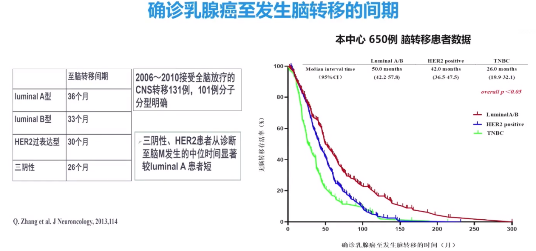 患者确诊乳腺癌后至发生脑转移的间期在不同亚型乳腺癌中是不同的,三阴性与HER2阳性乳腺癌患者至脑转移发生的中位时间显著较Luminal A/B型患者短。因此,对于这部分患者,指南中强调乳腺癌患者早期可以增加脑部的检查频率,以尽早发现脑转移。