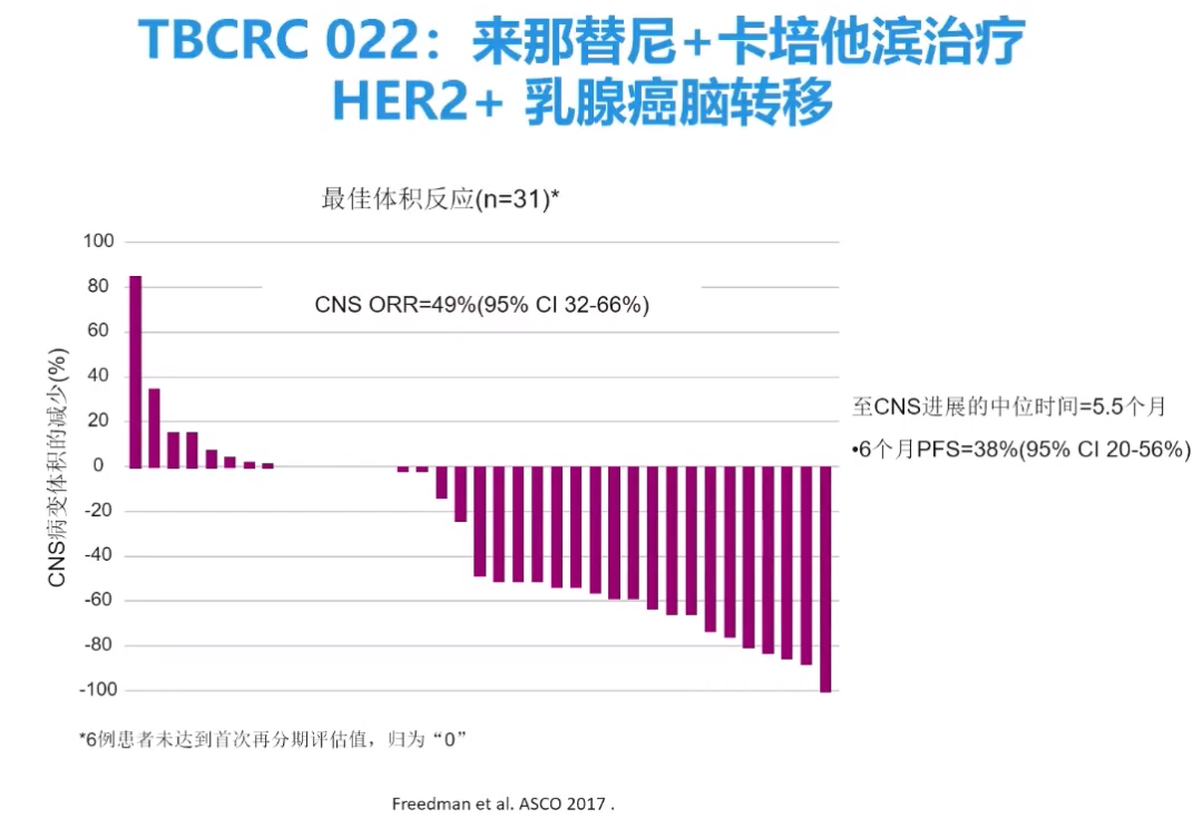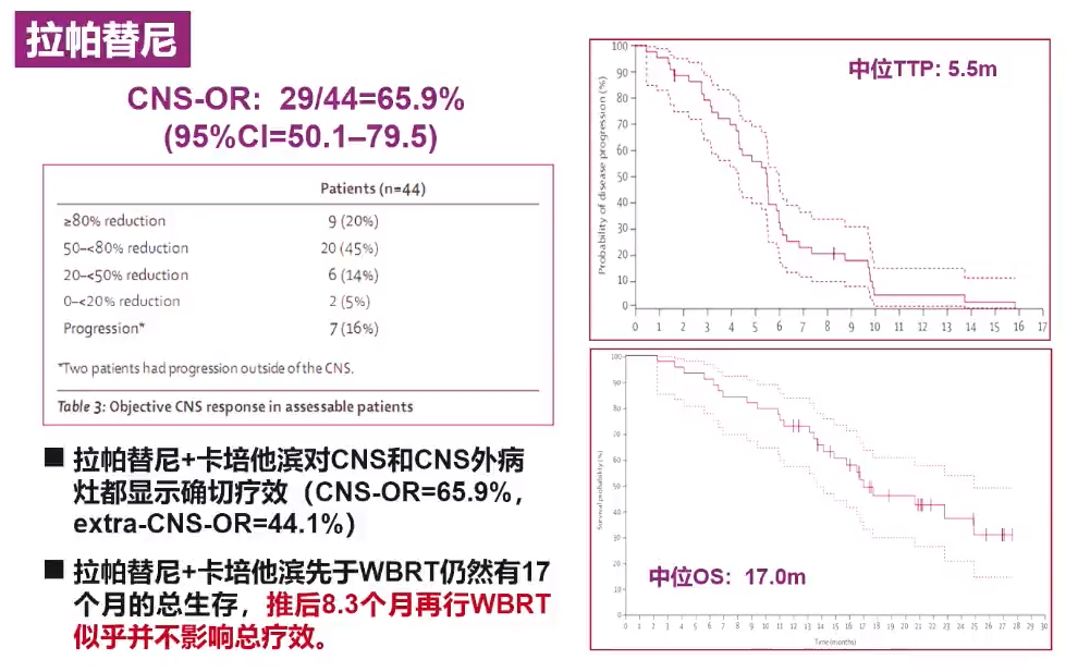 此外,TBCRC 022研究中,奈拉替尼联合卡培他滨治疗HER2脑转移的乳腺癌患者也显示出了良好的治疗效果(CNS ORR=49% 95%CI:32%~66%)。