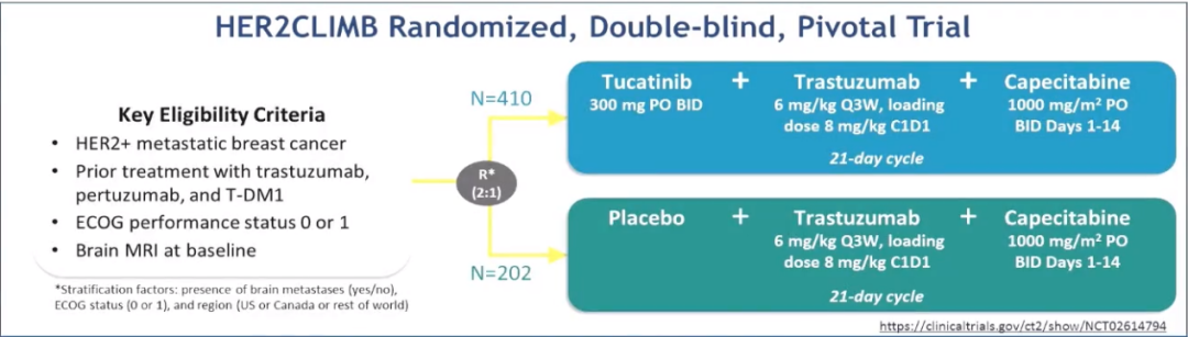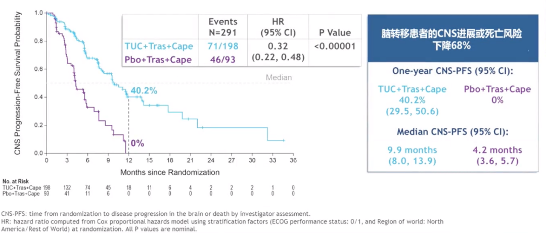 第一个前瞻对照Ⅲ期临床研究HER2CLIMB研究结果显示,在291例既往有脑转移或基筛查时有脑转移的患者中,1年CNS-PFS在图卡替尼组为40.2%,对照组为0%。图卡替尼组颅内进展或死亡的风险下降了68%(HR=0.32;95%CI 0.22~0.48;P<0.0001),中位CNS-PFS 图卡替尼组为9.9(8.0~13.9)个月,对照组为4.2(3.6~5.7)个月。1年的OS率图卡替尼组为70.1%,对照组为46.7%,图卡替尼组死亡风险减少42%(HR=0.58;95%CI 0.40~0.85;P=0.005),中位OS 图卡替尼组18.1个月,对照组为12.0个月。