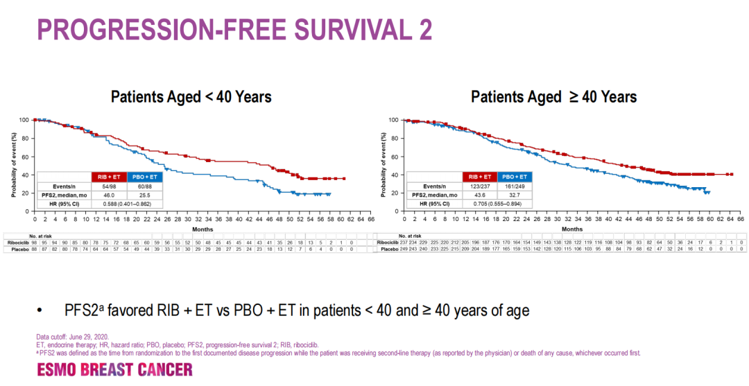 在<40岁和≥40岁的患者中,瑞博西利+ET对比安慰剂+ET均显示OS延长,其中<40岁患者的死亡风险降低35%(51.3 vs 40.5个月;HR=0.65;95%CI:0.43~0.98);≥40岁患者的死亡风险降低19%(中位OS:58.8 vs 51.7个月;HR=0.81;95%CI:0.62~1.07)。在NSAI治疗患者和PFS 2[患者接受二线治疗(由医生报告)或任何原因死亡(以先发生者为准)时,从随机分组到首次记录疾病进展的时间]、患者的OS、化疗时间(CT)和无CT生存期中也看到了如此的趋势。