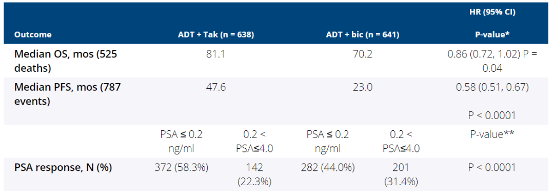 相较于比卡鲁胺组,TAK-700组的进展和死亡风险显著降低42%(mPFS:47.6 vs 23.0;HR 0.58;95%CI:0.51~0.67),PSA缓解率也有显著改善。虽然TAK-700组的OS相较比卡鲁胺组有10.9个月的延长(mOS:81.1 vs 70.2;HR 0.86,95%CI:0.72~1.02,P=0.04),但并未达到研究预设的统计学阈值(P=0.025)。