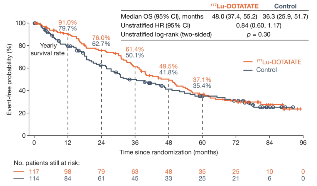 NETTER-1研究的治疗组和对照组后续进行随访或至少一种以上的系统性治疗,包括化疗、依维莫司、再次177Lu-DOTATAE PRRT或其他放射性配体介导的PRRT。最终,177Lu-DOTATAE组以11.7个月的OS优势胜于长效奥曲肽60mg对照组(48.0个月 vs 36.3个月),然而这样的成绩却并没有达到统计学意义(HR: 0.84,95%CI:0.6~1.17,P=0.30)。临床获益明显,但统计学上不显著,Statistics真是一门很玄妙的科学……
