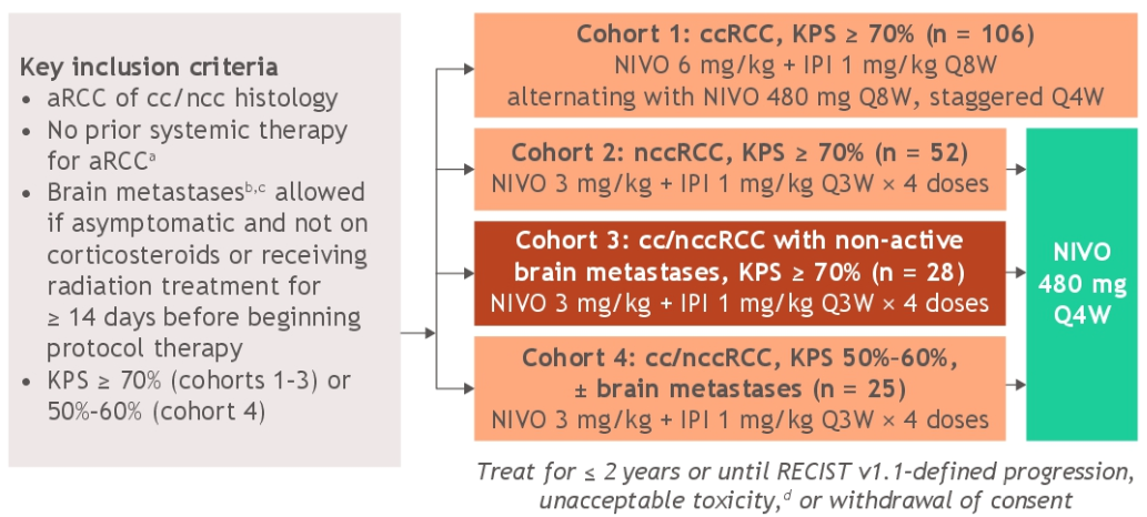 方法:先前未接受治疗的任何病理结果以及无临床症状的脑转移(尚无接受激素或放疗)的晚期转移性肾癌患者,KPS≥70%,分配至纳武单抗3 mg/kg联合伊匹单抗1 mg/kg每3周,4个疗程的治疗后序贯纳武单抗480 mg每4周持续不超过2年或者直至疾病进展/无法耐受的药物毒性反应而停药。主要研究终点为研究药物最后1个疗程的100天以内3级以上的免疫相关不良反应。次要研究终点为依据RECIST v1.1(包含每位研究者)评价标准的无病生存期(PFS)和客观缓解率(ORR)。探索性研究终点为总体生存期(OS)。