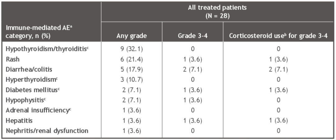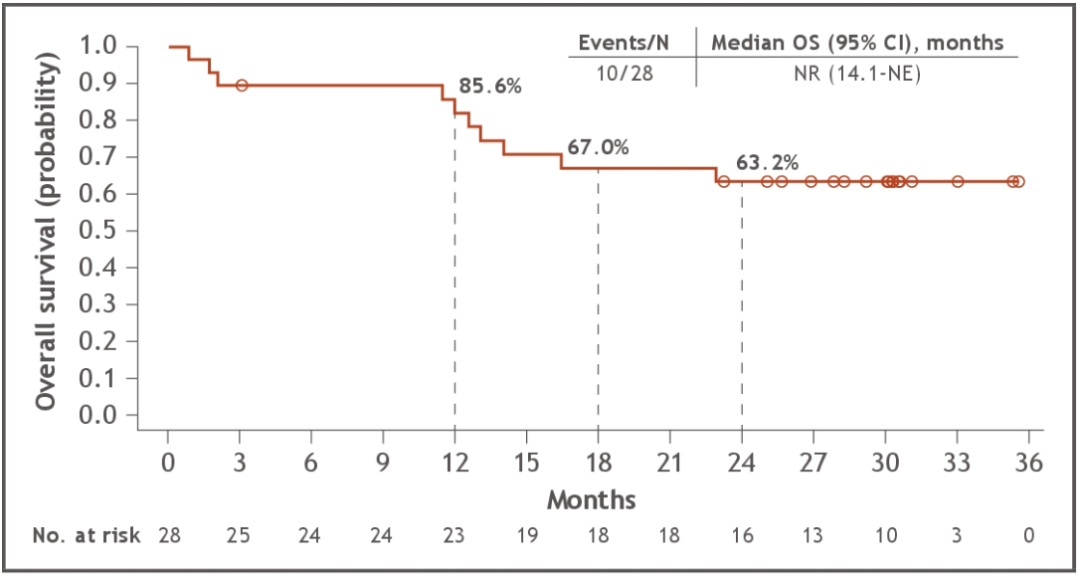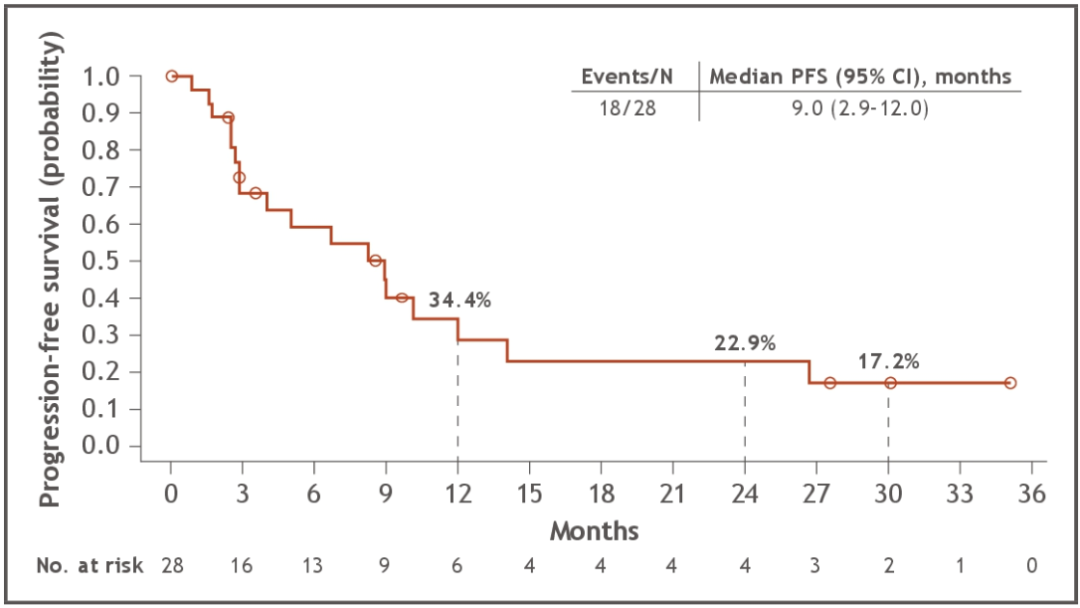 结果:28名经治脑转移患者中85.7%为男性,中位(范围)年龄60(38–87)岁,14.3%含有肉瘤样特征。28名招募患者给予24.5个月最低随访时间,中位治疗持续时间(范围)为纳武单抗3.4(0.0–23.3)个月,伊匹单抗2.1(0.0–3.3)个月。没有5级免疫相关不良反应事件发生。3-4级免疫相关不良反应包括腹泻/结肠炎(7.1%)、垂体炎(3.6%)、皮疹(3.6%)、肝炎(3.6%)和糖尿病(3.6%)。25名患者评估了客观缓解率(ORR),ORR为32.0%(95%CI:14.9~53.5)。没有一例完全缓解,8例部分缓解,10例疾病稳定。中位缓解时间(范围)为2.8(2.4–3.0)个月。中位缓解持续时间(范围)为24.0(3.9–无法评估),8名部分缓解患者中4名持续疾病无进展。28名患者中,7(25%)名有颅内进展,中位PFS为9.0(95%CI:2.9~12.0)个月,中位OS未达到。