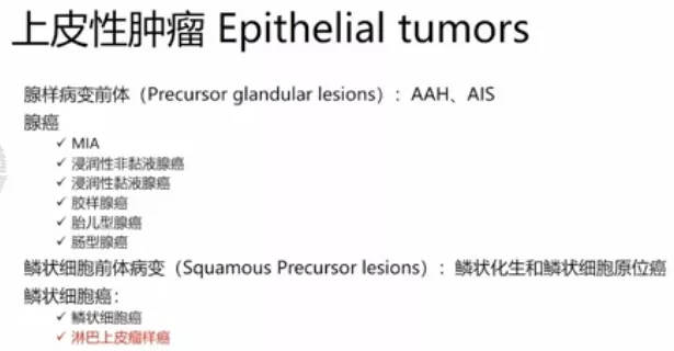 上海交通大学附属胸科医院韩昱晨教授的报告内容为《肺癌的病理及分子分型》,详细介绍了基于2021 WHO胸部肿瘤分类更新的《中华医学会肿瘤学分会肺癌临床诊疗指南》的病理部分。2021 WHO胸部肿瘤分类新增了胸部SMARCA4缺失未分化肿瘤和玻璃样变透明细胞癌,浸润性非黏液腺癌分级和肺神经内分泌肿瘤也有一些更新。对于上皮性肿瘤,过去未分类癌中的“淋巴上皮瘤样癌”被归为鳞状细胞癌;胸部SMARCA4缺失未分化肿瘤是一种分化很差的上皮肿瘤;在涎腺型肿瘤中,新增玻璃样变透明细胞癌。