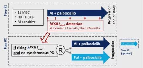 ◆ 研究设计:PADA-1研究(NCT03079011)是一项多中心、随机、3期临床试验,纳入了一线AI敏感(既往未接受AI治疗或辅助AI完成后DFI>12月)的HR+/HER2- mBC患者,旨在定期监测血cf DNA的ESR1突变情况(bESR1m),一旦发生bESR1m且疾病尚未临床进展,探索转换PAL+Ful方案与继续PAL+AI的疗效。