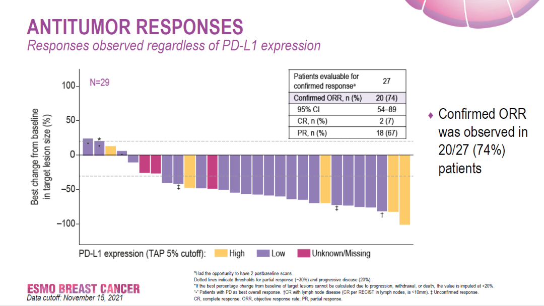这项Ⅰb/Ⅱ期BEGONIA研究将Dato-DXd联合抗PD-L1抗体用于晚期TNBC一线治疗,初步数据显示ORR达到74%,且安全性良好,没有观察到剂量限制性毒性。