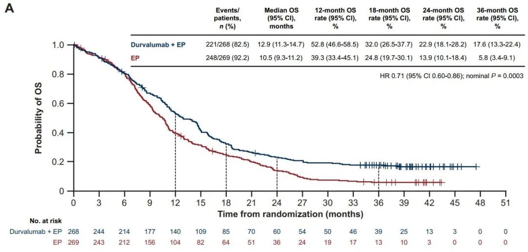 疗效:本次数据更新,durvalumab联合化疗相较单纯化疗的获益仍然持续,HR=0.71,两组中位OS分别为12.9个月和10.5个月,36个月OS率分别为17.6%和5.8%。在各个预示的亚组中均观察到了联合durvalumab的获益或获益趋势。
