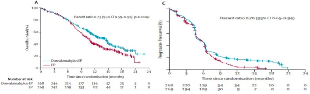 ●durvalumab[5,6]:基于的CASPIAN研究已经有3次数据报道,首次报道的数据同步发表于Lancet杂志。该研究设置了3组:接受单化疗、单免疫或双免疫治疗,并将单免疫vs化疗、双免疫vs化疗的OS作为主要终点。首次分析时候,单免疫和单纯化疗组的中位OS分别为13.0个月和10.3个月(HR=0.73,P=0.0047);12个月的OS率分别为54%和40%;两组中位PFS分别为5.1个月和5.4个月,两组6个月的PFS率分别为45%和46%,12个月的PFS率分别为18%和5%;双免疫治疗与化疗相比的OS尚未达到,需要继续随访。