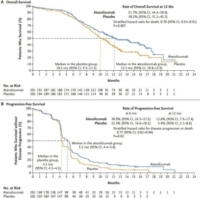 随后,2020年11月,该研究于JCO杂志公布了其更新后的OS及基于标志物的分析结果。数据更新时,全组中位随访时间为22.9个月,共出现302例死亡事件,OS数据与首次报道相仿,两组中位OS分别为12.3个月和10.3个月,HR=0.76,P=0.015,18个月OS率分别为34%和21.0%。