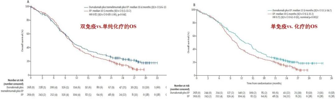 在进行第2次统计分析时,双免疫相较于单纯化疗,并未展现出更好的疗效。基于数据分析时候观察到的事件数,最终两组的OS比较时,显著性水准设定为0.0418,两组的OS分别为10.4个月和10.5个月,HR=0.82,P=0.045,小于预设的显著性水准,差异无统计学意义。但本次更新时,单免疫与化疗相比的数据变化不大,再次支持联合durvalumab的一线标准治疗地位。