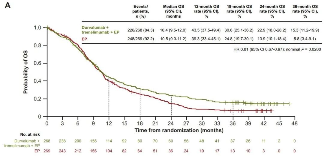 双免疫联合化疗相较于单纯化疗展现出来了数值上的获益,两组中位OS分别为10.4个月和(双免疫)10.5个月(单纯化疗),HR=0.81,P=0.02,36个月OS率分别为15.3%和5.8%。