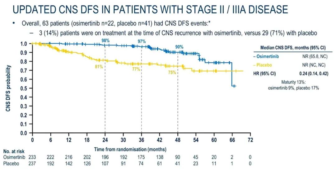 共有63名患者经历了CNS DFS事件;其中22名患者在奥希替尼组,41名在安慰剂组。奥希替尼组未达到中位CNS DFS(95%CI: 65.8-NC),安慰剂组也未达到(95%CI: NC-NC)(HR=0.24;95%CI: 0.14-0.42);两组的24个月CNS DFS率分别为98%和81%,36个月CNS DFS率分别为97%和77%,48个月CNS DFS率分别为90%和75%。奥希替尼组和安慰剂组在36个月时观察到CNS复发率分别为2%(95%CI: 0.9%-5.0%)和13%(95%CI: 8.5%-18.5%),奥希替尼组的CNS复发的累积发生率相比对照组始终更低。