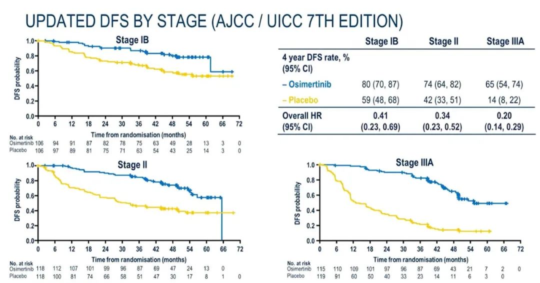 在II/IIIA期患者中,奥希替尼组(n=233)和安慰剂组(n=237)分别经过中位44.2个月和19.6个月的随访,更新的中位DFS数据分别为65.8个月vs 21.9个月(风险比[HR]=0.23;95%CI: 0.18-0.30) 。