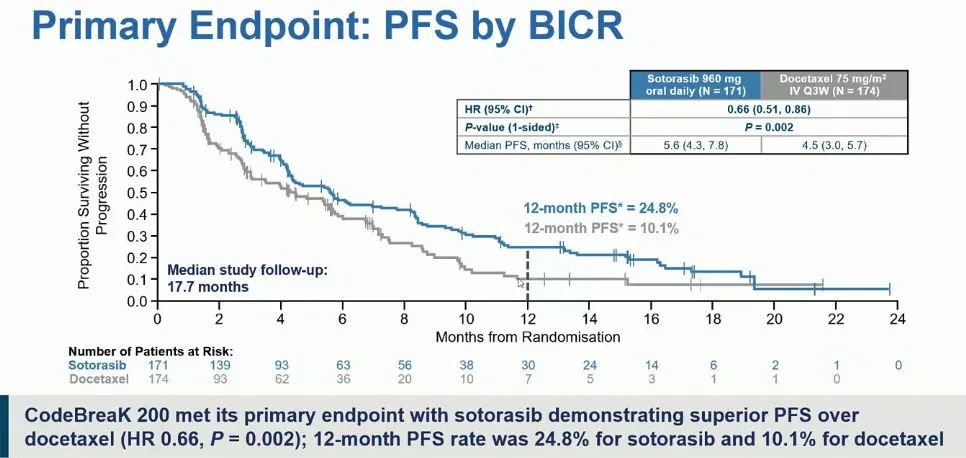在KRAS G12C突变的晚期和转移性NSCLC经治患者中开展的III期CodeBreaK 200试验的初步分析显示,该研究达到了其主要终点,即在中位随访17.7个月后,相比多西他赛,sotorasib治疗使患者的无进展生存期(PFS)显著改善,中位PFS分别为5.6个月和4.5个月(风险比[HR]=0.66;95%置信区间[CI]: 0.51-0.86;p=0.002)。sotorasib组的1年PFS率为24.8%,多西他赛组为10.1%,PFS获益在各亚组一致。