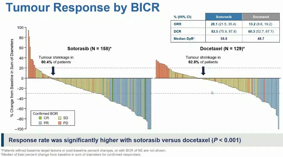客观缓解率(ORR)也是sotorasib组(28.1%;95%CI: 21.5-35.4%)相比多西他赛组(13.2%;95%CI: 8.6-19.2%)显著更高(p<0.001), 两组分别有80.4%和62.8%的患者肿瘤缩小;疾病控制率(DCR)分别为82.5%和60.3%。