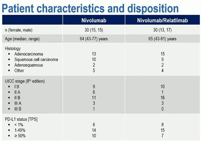 本研究纳入IB期、II期或IIIA期(UICC第8版分期)的非小细胞肺癌患者,并由多学科肺癌委员会确定肿瘤可切除,且器官功能均能耐受手术。60例患者按1:1随机分组,分别于手术切除前第1天和第15天接受240 mg纳武利尤单抗联合或不联合80 mg Relatlimab治疗,然后患者接受手术,术后进行标准辅助治疗。