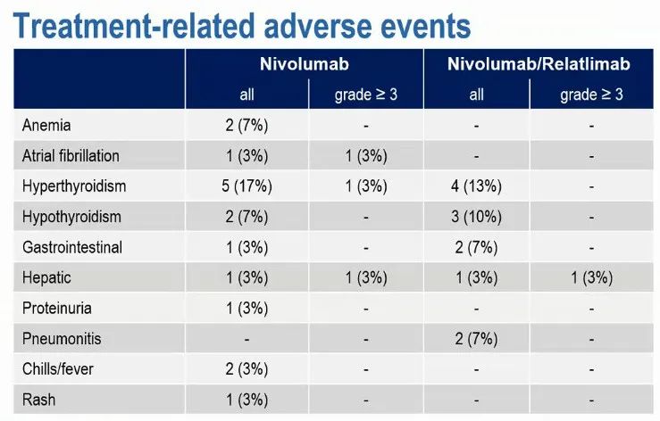 本研究没有观察到新的安全事件。总的来说,最常见的全级别治疗相关不良反应是甲状腺功能亢进,单药组17%的患者发生甲状腺功能亢进,联合治疗组为13%。