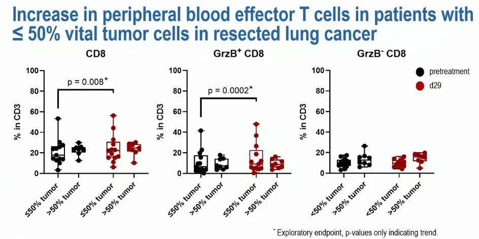 在PD-L1<1%、PD-L1 1%~49%和PD-L1≥50%的患者中,组织病理学缓解率相似。值得注意的是,在切除肿瘤中存活肿瘤细胞≤50%的患者,其外周血效应T细胞增加。生物标志物的其他研究正在进行中。
