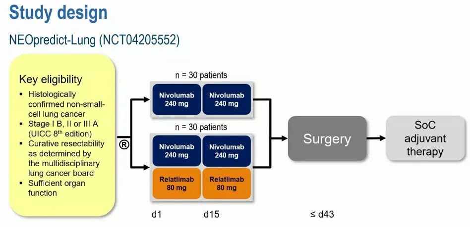 1.Schuler M,et al.A randomized,multicentric phase II study of preoperative nivolumab plus relatlimab or nivolumab in patients with resectable non-small-cell lung cancer(NEOpredict-Lung).ESMO Congress 2022,LBA37