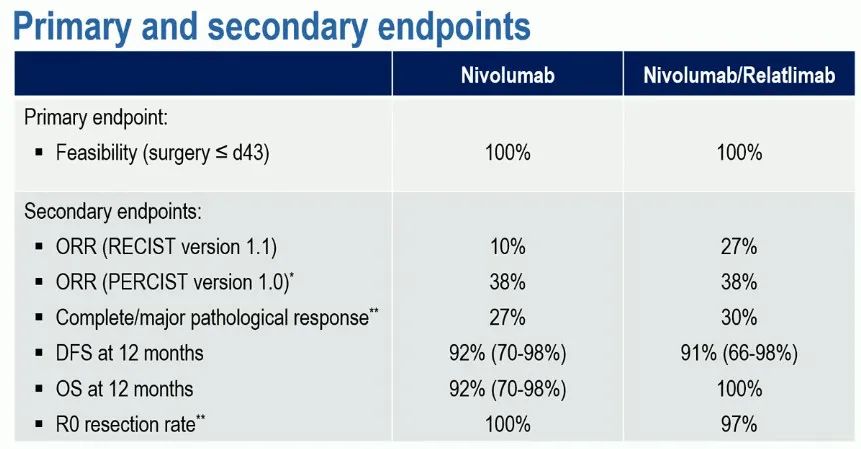 纳武利尤单抗单药组及纳武利尤单抗联合Relatlimab组的所有患者均在首次用药后43天内实施手术,新辅助治疗没有导致手术延迟。在经过5.68个月的中位随访后,次要终点数据也显示单药组和联合治疗组都获得较好的疗效结果,包括客观缓解率(分别为10%vs 27%)、完全或主要病理缓解率(27%vs 30%)、12个月无病生存率(92%vs 91%)、12个月总生存率(92%vs 100%)和R0切除率(100%vs 97%)。
