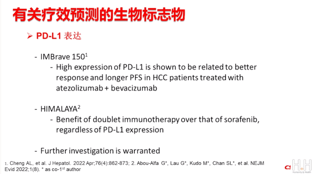 廖家杰教授:在IMbrave150研究中,发现PD-L1高表达水平患者治疗应答良好,无进展生存期也较长。但在我们的HIMALAYA研究中,没有发现PD-L1表达水平与疗效的相关性,这可能与加入了抗CTLA-4单抗tremelimumab,令PD-L1表达作为治疗方案选择的指导作用大减。未来还需要更进一步的研究以期找到合适的生物标志物来用于指导肝癌的免疫治疗。